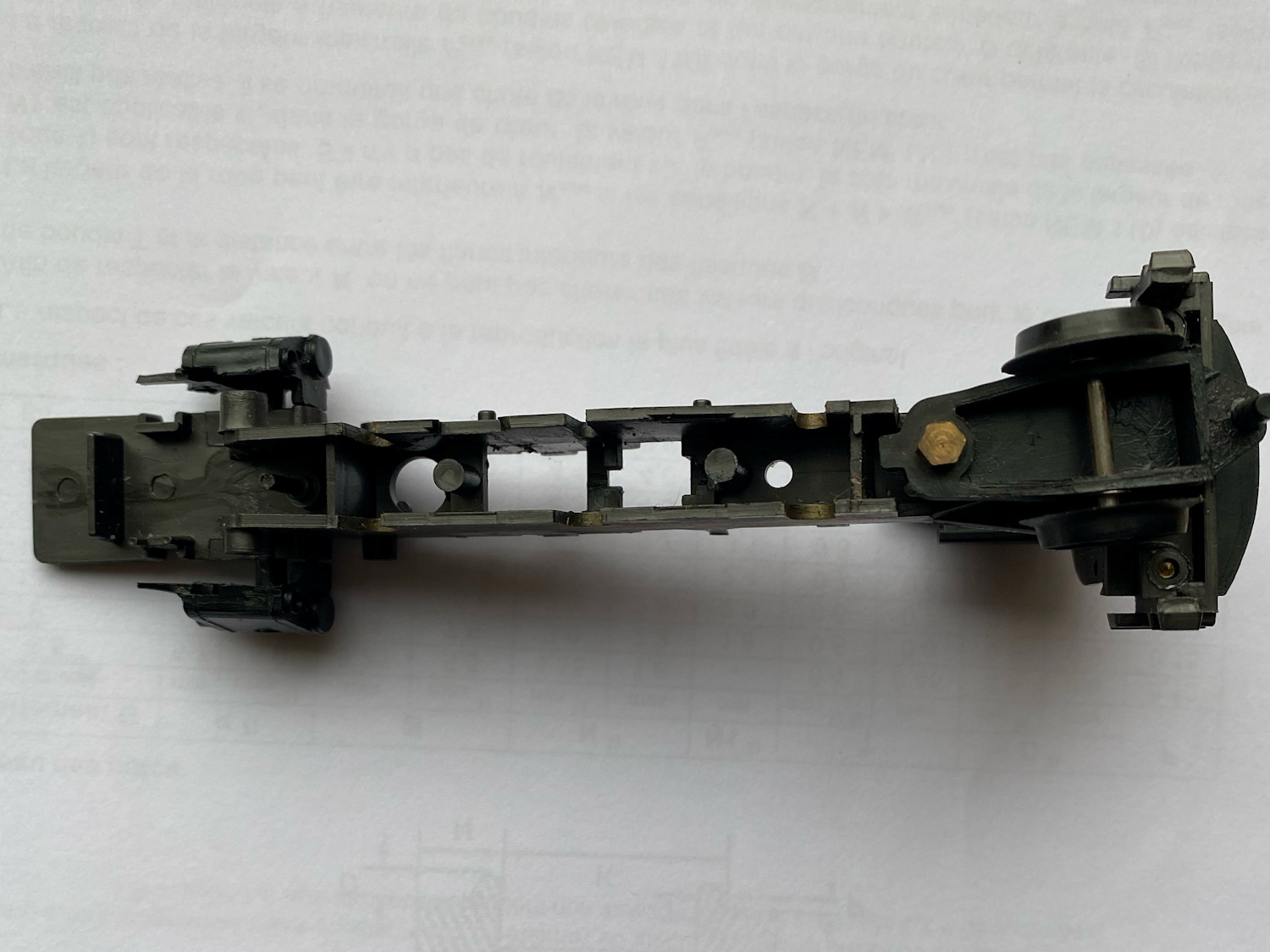 Sur les flancs droits des longerons, on voit l'ergot du pignon intermédiaire entre les essieux successifs mais, dans cette version, une seule roue est équipée d'un pignon inutilisé.