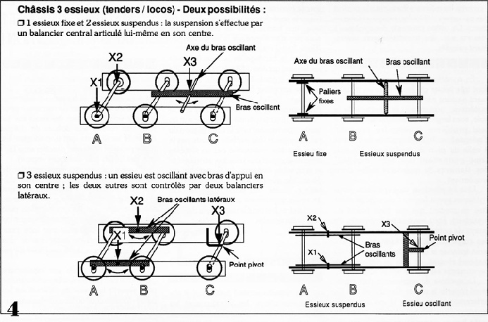 On y voit un chassis de 030 muni d’un axe moteur fixe et de deux axes moteurs oscillants associés par un balancier définissant un troisième point de sustentation par rapport à la voie à distance donnée du plan de roulement, c’est la fameuse suspension à trois points.