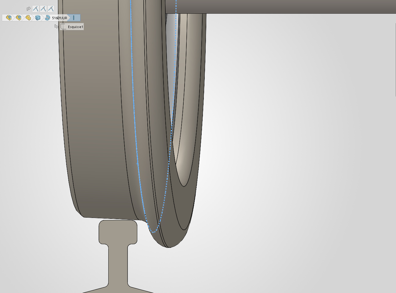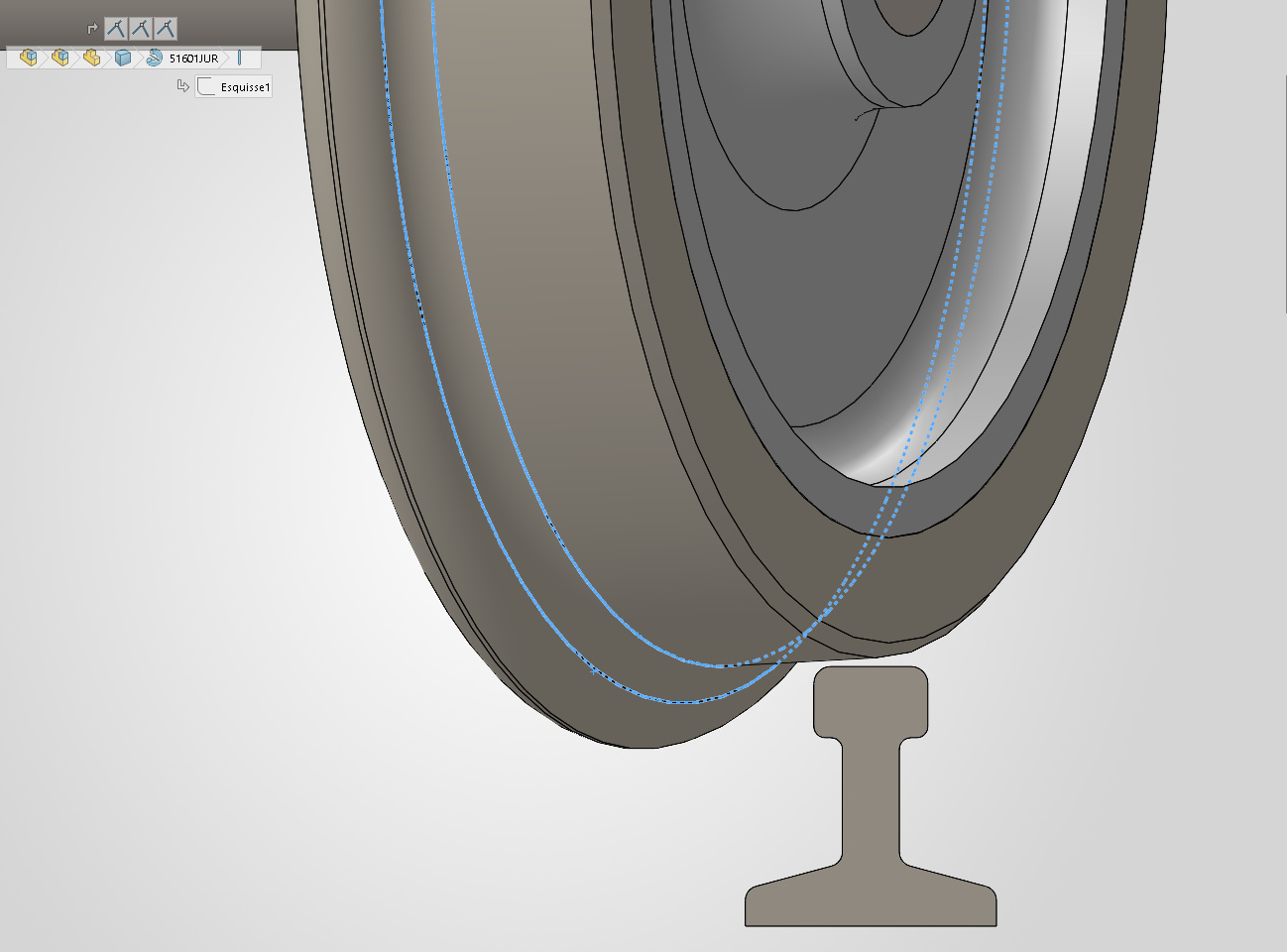 Le cercle à mi hauteur du boudin, qui marque le point d’inflexion entre le congé de raccordement au plan de roulement et les trois arrondis du boudin, ne touchera pas le rail en premier.