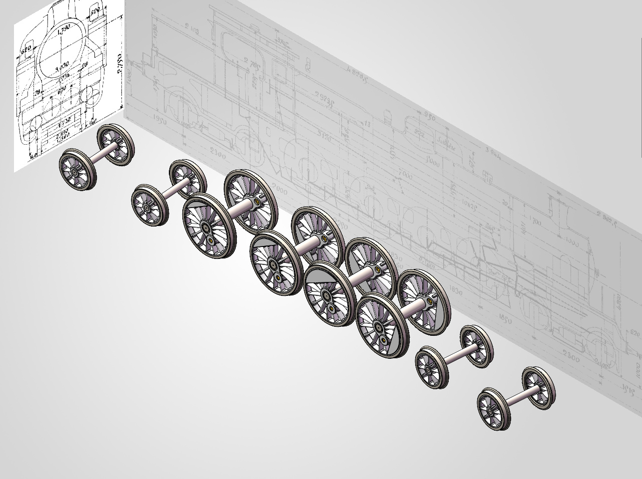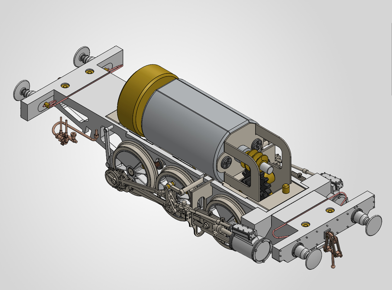 Le réducteur emmène la locomotive par l’essieu avant M1, ce qui est une idée à suivre dans ce cas puisque la suppression du jeu latéral permet de limiter l’encombrement entre les crosses de piston, et donc de ne pas surécarter les cylindres.
