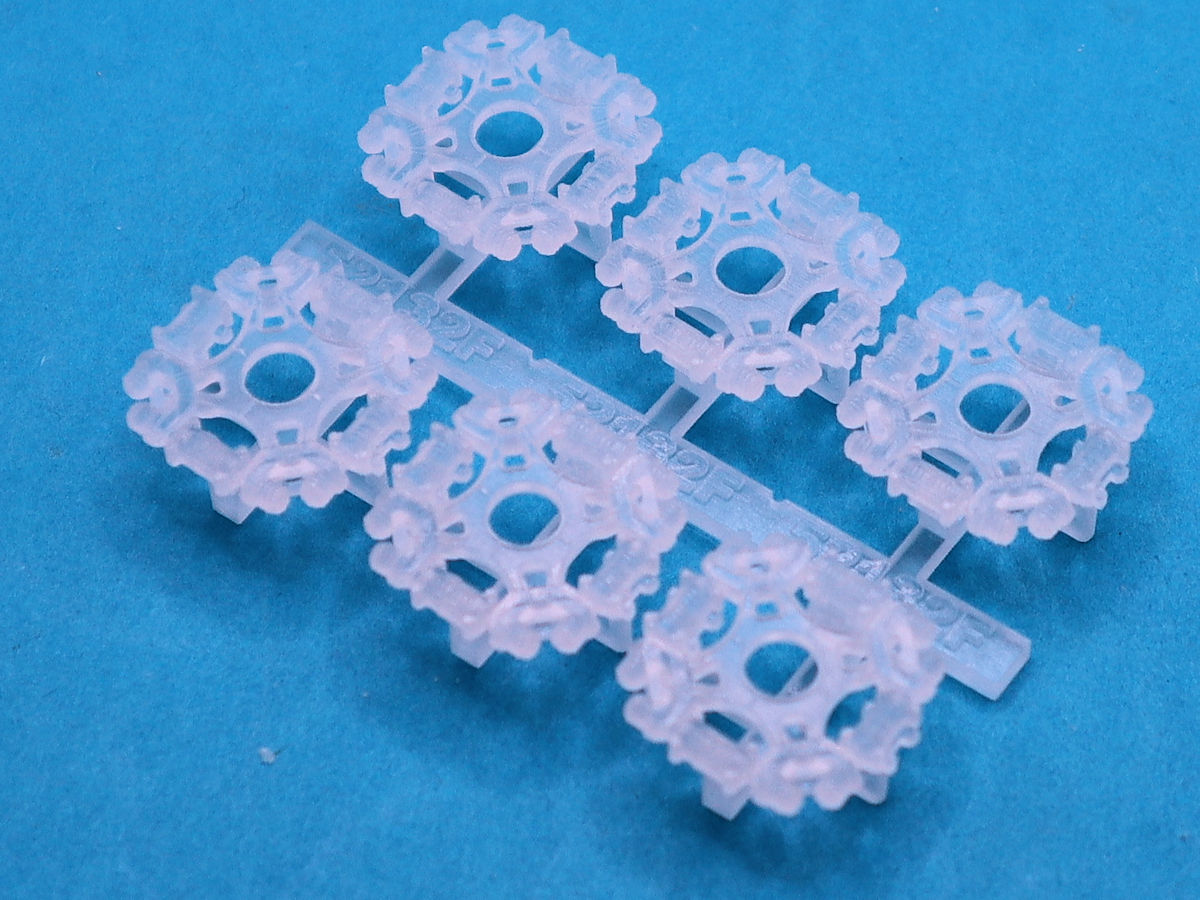 L'entraînement élastique des roues par arbre creux est représenté par une pièce ajoutée tirée d'une grappe en impression 3D, la grappe comportant 6 moyeux.