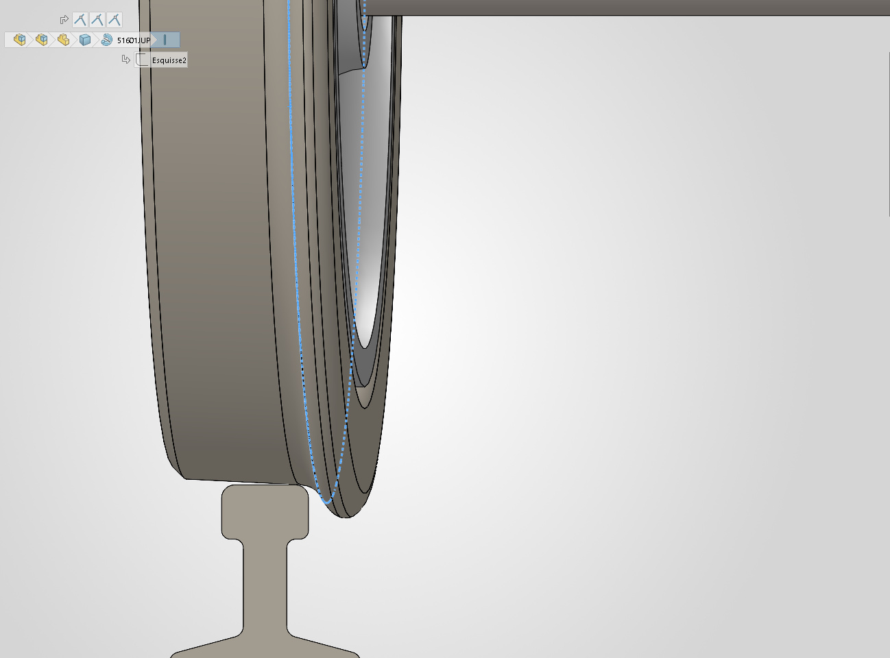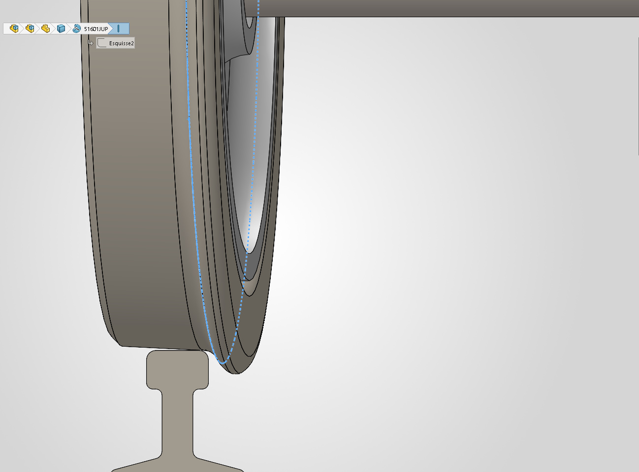 Le cercle à mi hauteur du boudin, qui marque le point d’inflexion entre le congé de raccordement au plan de roulement et les trois arrondis du boudin, ne touchera pas le rail en premier.