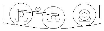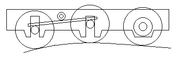 Voici déjà la vue en « coupe » de la voie au centre de cet essieu et observons la vue perpendiculaire à la voie, le chassis du wagon étant aligné sur la corde de l’arc de courbe dont la longueur est égale à l’empattement du wagon.