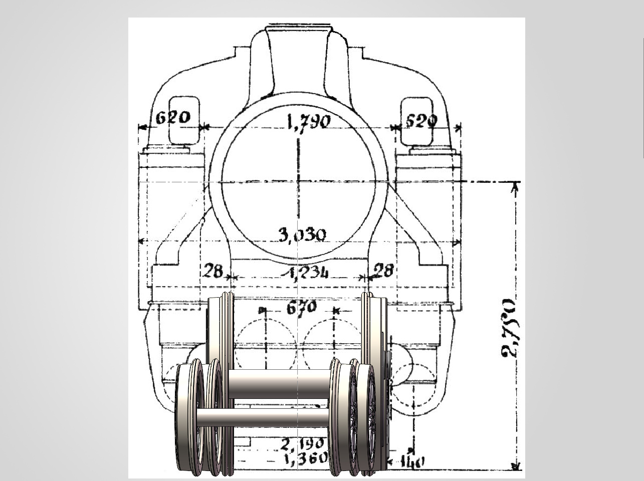 Le réducteur emmène la locomotive par l’essieu avant M1, ce qui est une idée à suivre dans ce cas puisque la suppression du jeu latéral permet de limiter l’encombrement entre les crosses de piston, et donc de ne pas surécarter les cylindres.